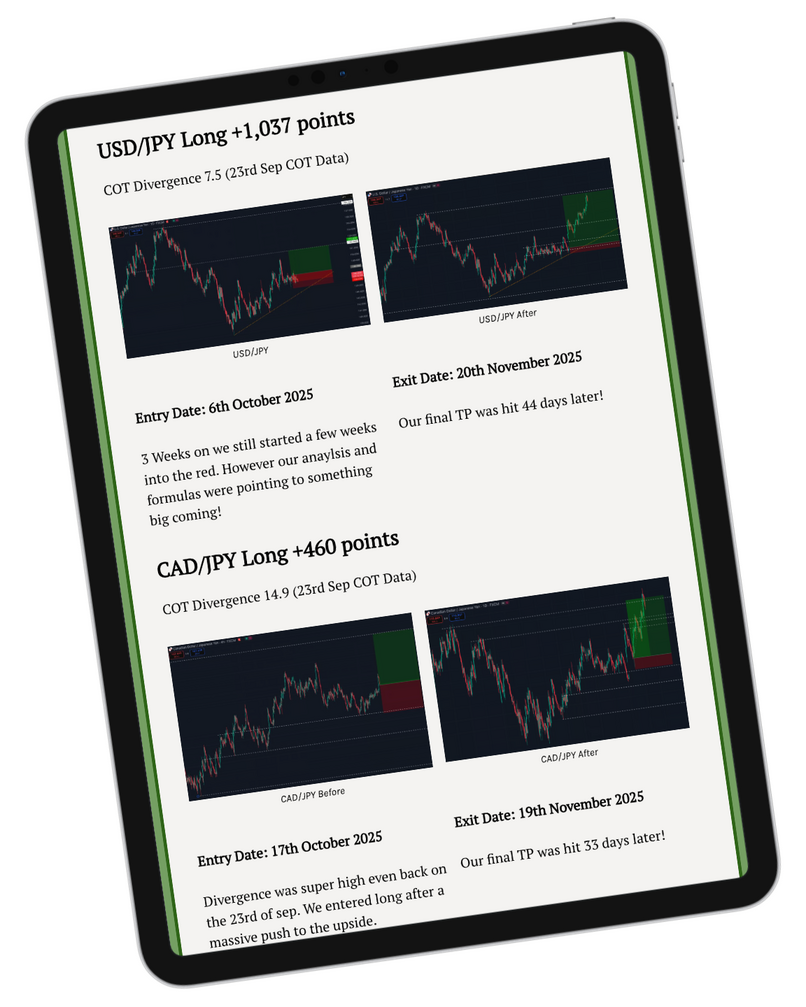 Each week we break down the CFTC Commitment of Traders (COT) data across all the global financial markets. We run the numbers, ratios, correlations, and divergence formulas to spot when commercials (smart money) and large speculators are positioned. Divergence over 5+ is recorded in the report and divergence over 10+ triggers further analysis for potential trade setups or big market moves. Essentially, it's a quantitative, data-driven outlook to help you make smarter, more informed trading decisions every week.